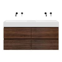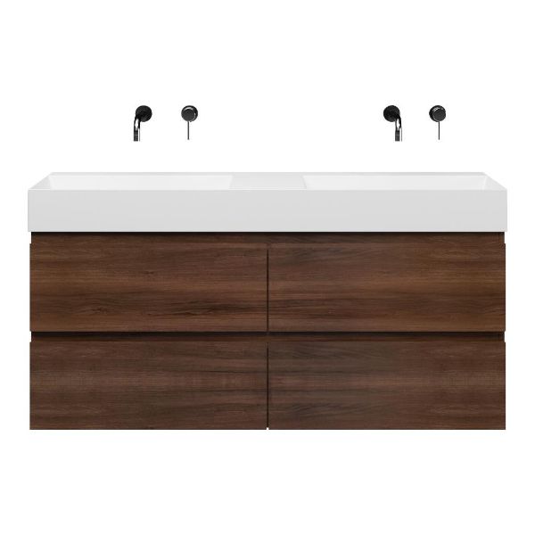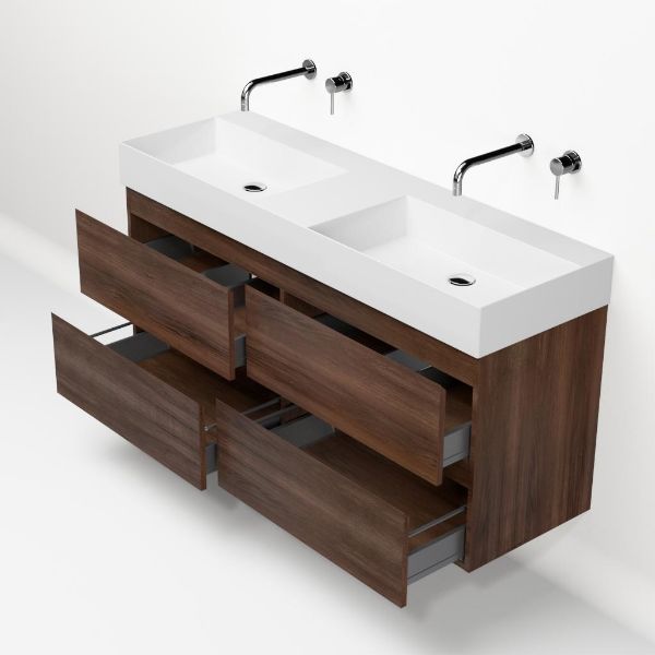 | | Bellanti Gisella/Azzurra badmeubel 140x46 4 softclose laden walnoot greeploos keramische wastafel dubbel wit glans zonder kraangaten |
