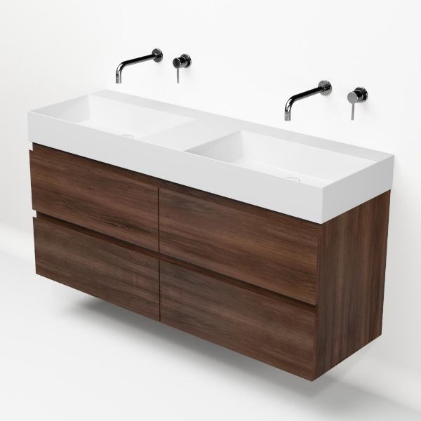 | Bellanti Gisella/Azzurra badmeubel 140x46 4 softclose laden walnoot greeploos keramische wastafel dubbel wit glans zonder kraangaten |