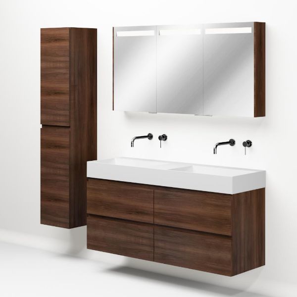 Greeploos badkamermeubel in de kleur walnoot is 140 cm breed. De wastafel is vervaardig in keramiek en heeft de kleur wit keramiek. Dit badkamermeubel met deze wastafel is leverbaar tussen de 60 cm t/m 160 cm