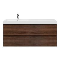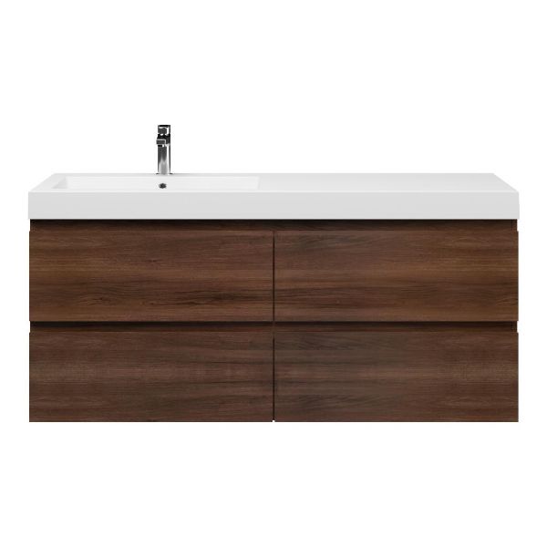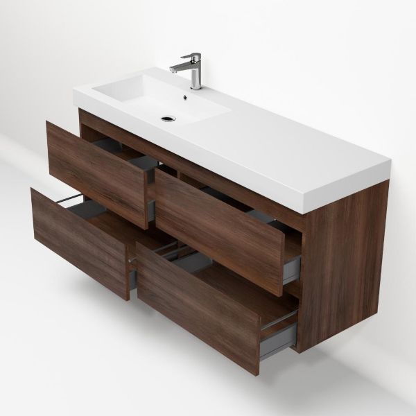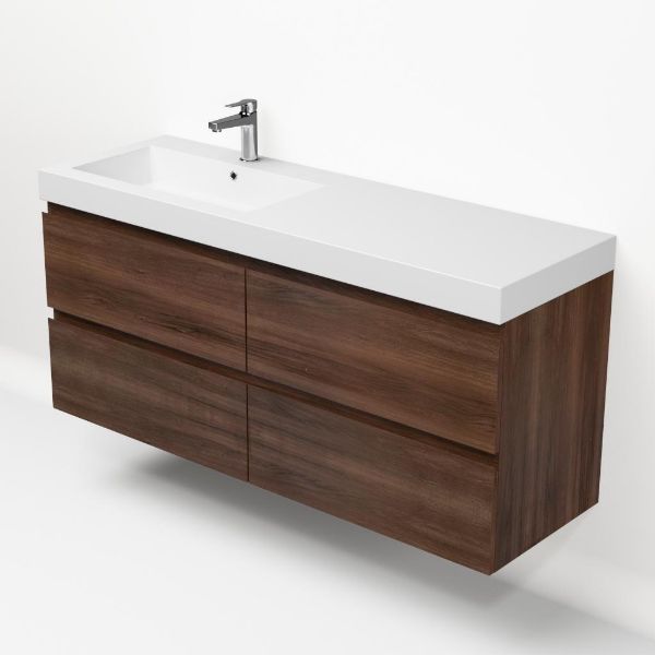 Greeploos badkamermeubel in de kleur walnoot is 140 cm breed.  De wastafel is vervaardig in polystone en heeft de kleur wit. Dit badkamermeubel met deze wastafel is leverbaar tussen de 60 cm t/m 200 cm
