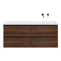 Greeploos badkamermeubel in de kleur walnoot is 140 cm breed.  De wastafel is vervaardig in polystone en heeft de kleur wit. Dit badkamermeubel met deze wastafel is leverbaar tussen de 60 cm t/m 200 cm
