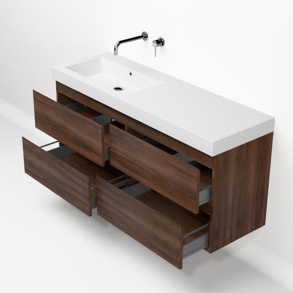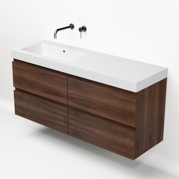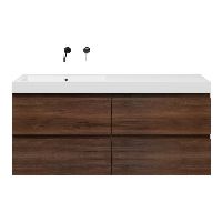 Greeploos badkamermeubel in de kleur walnoot is 140 cm breed.  De wastafel is vervaardig in polystone en heeft de kleur wit. Dit badkamermeubel met deze wastafel is leverbaar tussen de 60 cm t/m 200 cm
