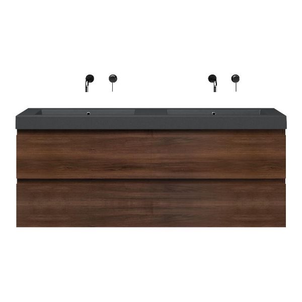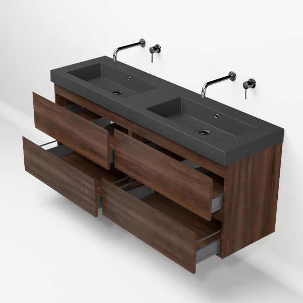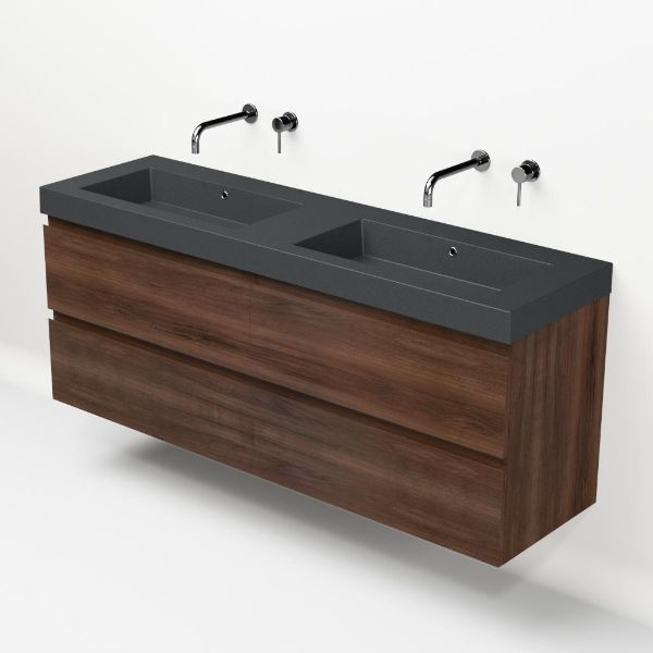 | | Bellanti Gisella/Esta-Q badmeubel 160x46 4 softclose laden walnoot greeploos quartz dubbele wastafel mat grijs zonder kraangaten |