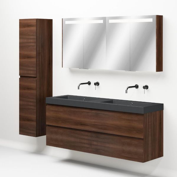 Greeploos badkamermeubel in de kleur walnoot is 160 cm breed. De wastafel is vervaardig in quartz en heeft de kleur grijs mat quartz. Dit badkamermeubel met deze wastafel is leverbaar tussen de 60 cm t/m 200 cm