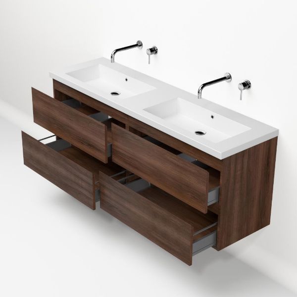 | Bellanti Gisella/Esta-Q badmeubel 160x46 4 softclose laden walnoot greeploos quartz dubbele wastafel mat wit zonder kraangaten |