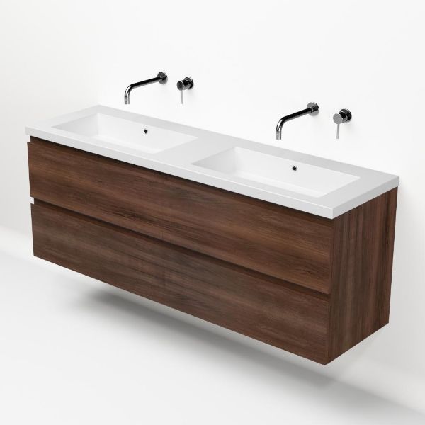 Greeploos badkamermeubel in de kleur walnoot is 160 cm breed. De wastafel is vervaardig in quartz en heeft de kleur wit mat quartz. Dit badkamermeubel met deze wastafel is leverbaar tussen de 60 cm t/m 200 cm
