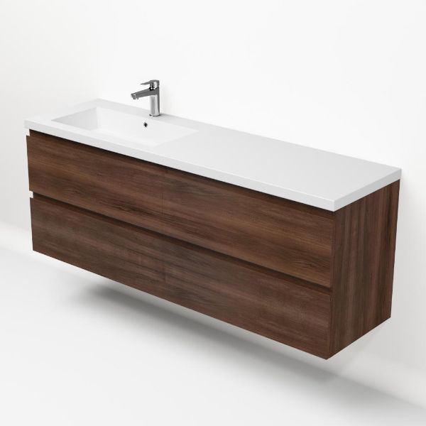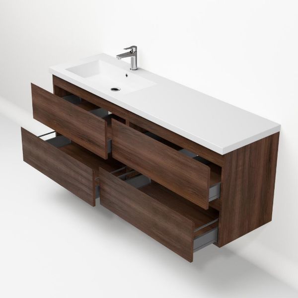 Greeploos badkamermeubel in de kleur walnoot is 160 cm breed.  De wastafel is vervaardig in polystone en heeft de kleur wit. Dit badkamermeubel met deze wastafel is leverbaar tussen de 60 cm t/m 200 cm