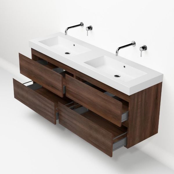 Bellanti Gisella/Esta badmeubel 160x46 4 softclose laden walnoot greeploos polystone dubbele wastafel wit zonder kraangaten