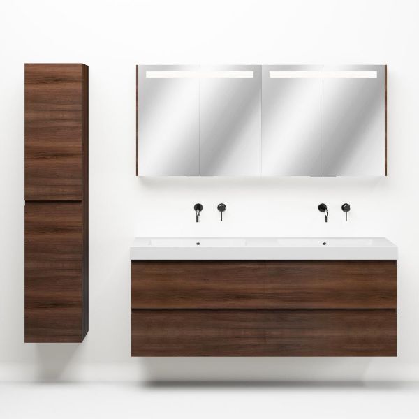 Greeploos badkamermeubel in de kleur walnoot is 160 cm breed.  De wastafel is vervaardig in polystone en heeft de kleur wit. Dit badkamermeubel met deze wastafel is leverbaar tussen de 60 cm t/m 200 cm