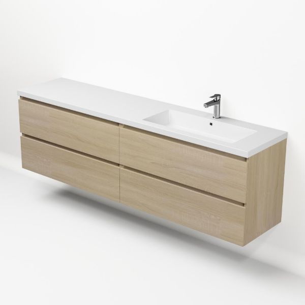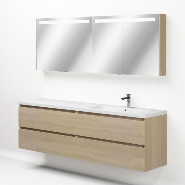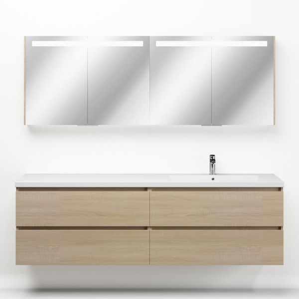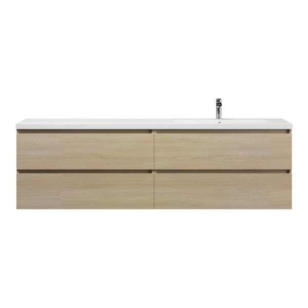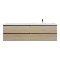 Greeploos badkamermeubel in de kleur eiken licht is 200 cm breed. De wastafel is vervaardig in polystone en heeft de kleur wit. Dit badkamermeubel met deze wastafel is leverbaar tussen de 60 cm t/m 200 cm