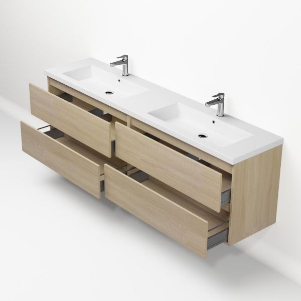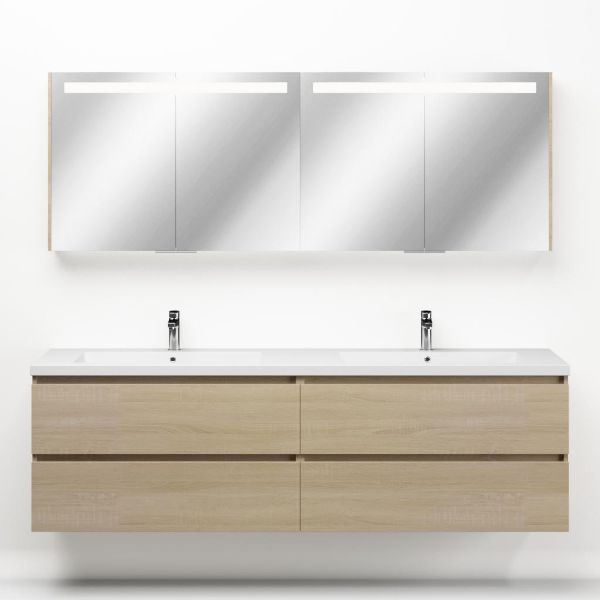Greeploos badkamermeubel in de kleur eiken licht is 200 cm breed. De wastafel is vervaardig in polystone en heeft de kleur wit. Dit badkamermeubel met deze wastafel is leverbaar tussen de 60 cm t/m 200 cm