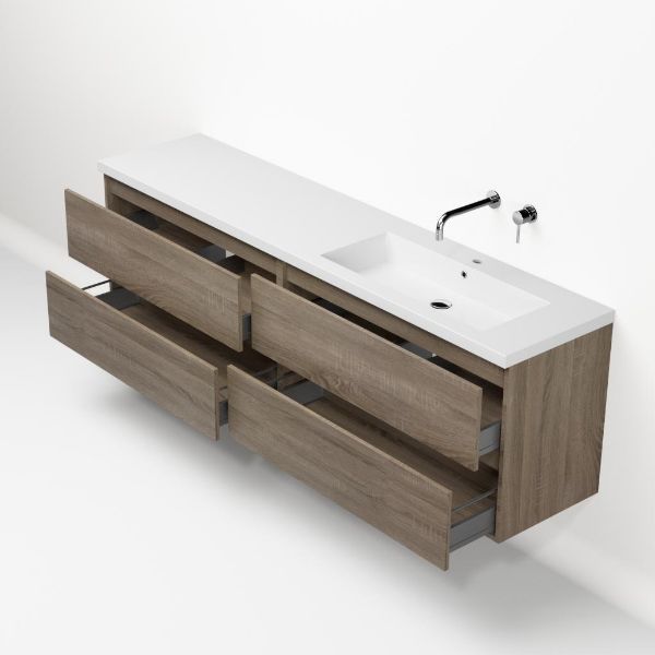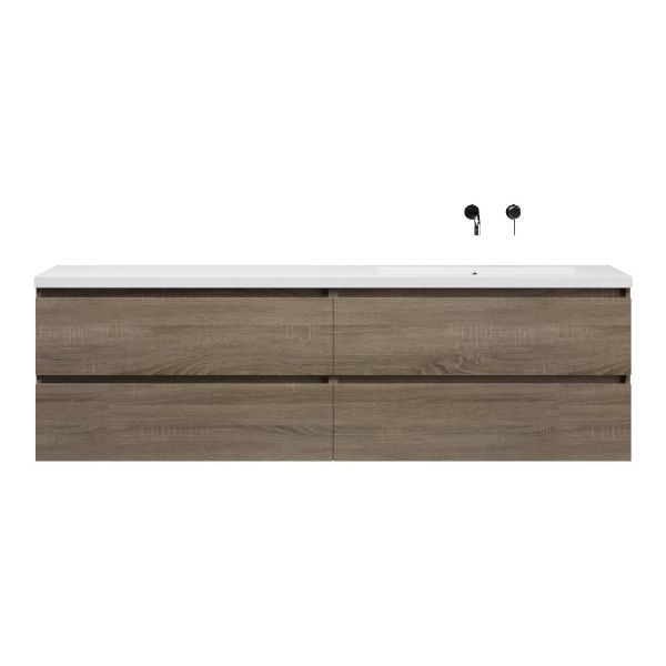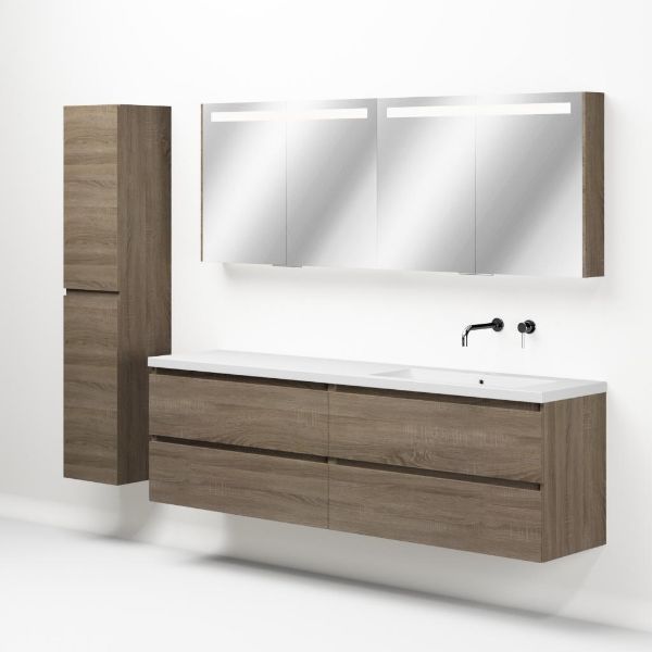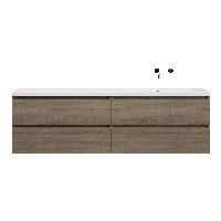 Greeploos badkamermeubel in de kleur eiken donker is 200 cm breed. De wastafel is vervaardig in polystone en heeft de kleur wit. Dit badkamermeubel met deze wastafel is leverbaar tussen de 60 cm t/m 200 cm