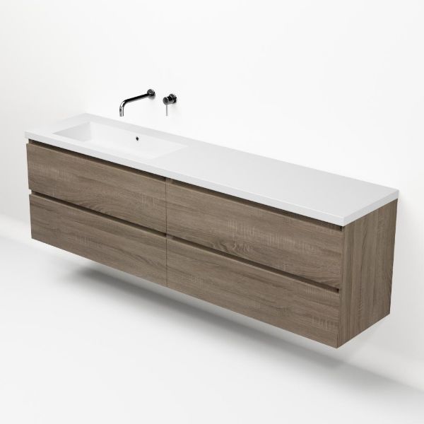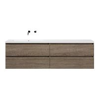 Greeploos badkamermeubel in de kleur eiken donker is 200 cm breed. De wastafel is vervaardig in polystone en heeft de kleur wit. Dit badkamermeubel met deze wastafel is leverbaar tussen de 60 cm t/m 200 cm