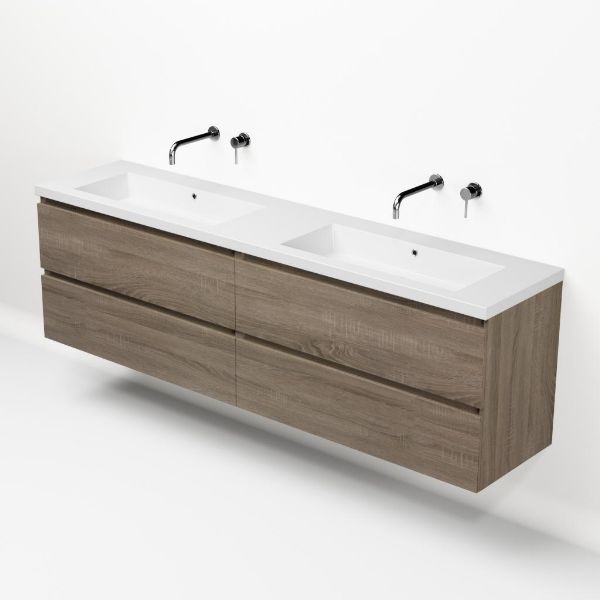 Greeploos badkamermeubel in de kleur eiken donker is 200 cm breed. De wastafel is vervaardig in polystone en heeft de kleur wit. Dit badkamermeubel met deze wastafel is leverbaar tussen de 60 cm t/m 200 cm