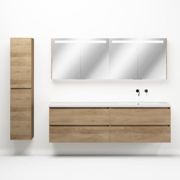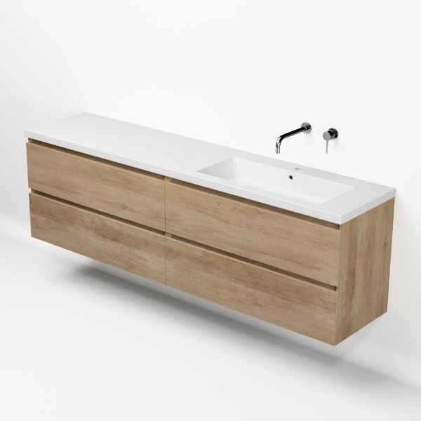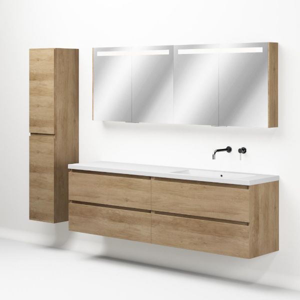 Greeploos badkamermeubel in de kleur olm is 200 cm breed. De wastafel is vervaardig in polystone en heeft de kleur wit. Dit badkamermeubel met deze wastafel is leverbaar tussen de 60 cm t/m 200 cm