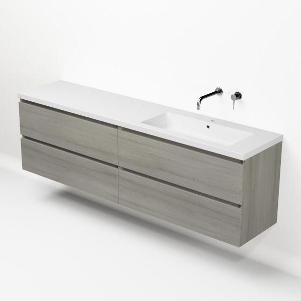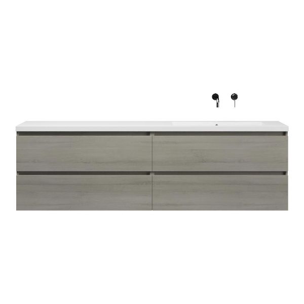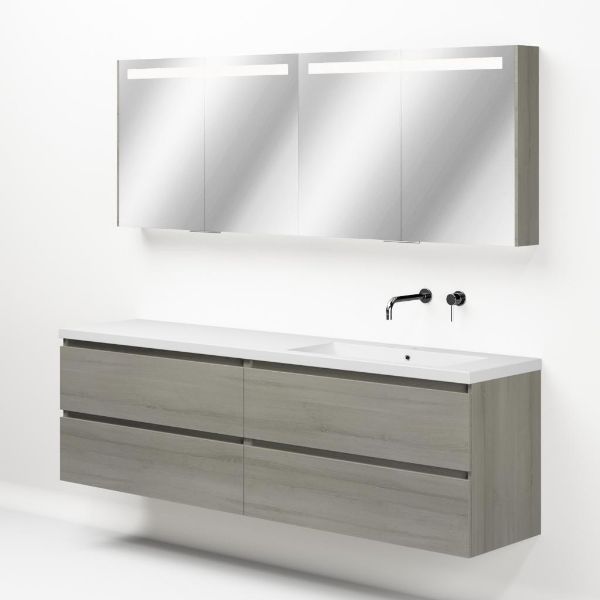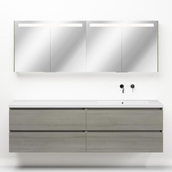 Greeploos badkamermeubel in de kleur eiken licht grijs is 200 cm breed. De wastafel is vervaardig in polystone en heeft de kleur wit. Dit badkamermeubel met deze wastafel is leverbaar tussen de 60 cm t/m 200 cm