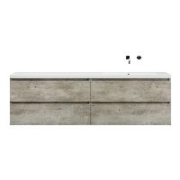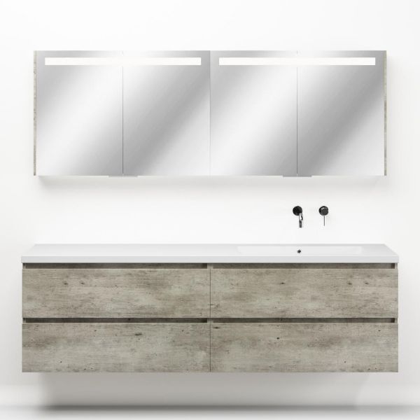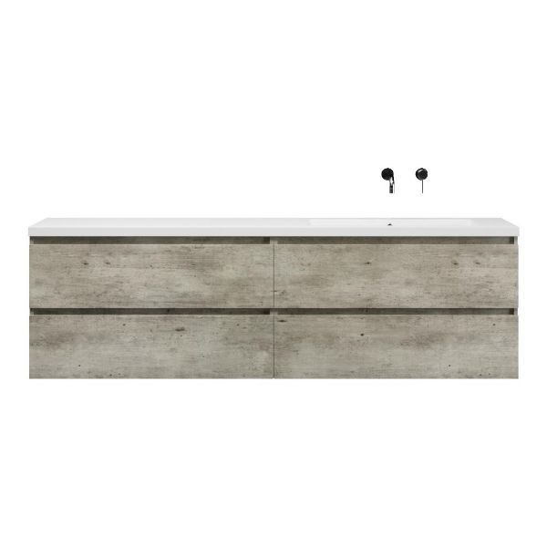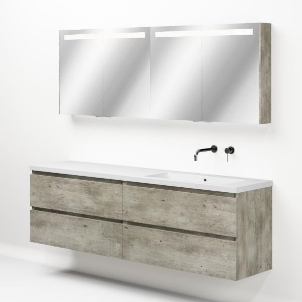 Greeploos badkamermeubel in de kleur steigerhout licht grijs is 200 cm breed. De wastafel is vervaardig in polystone en heeft de kleur wit. Dit badkamermeubel met deze wastafel is leverbaar tussen de 60 cm t/m 200 cm