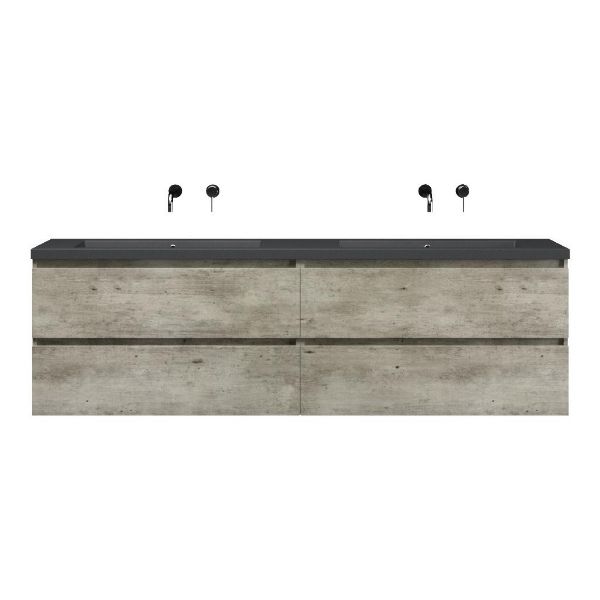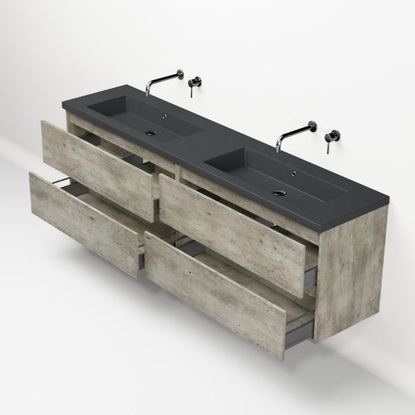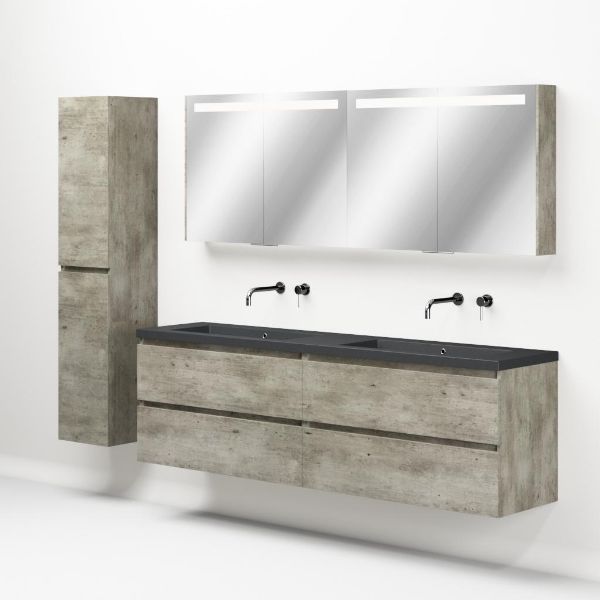 Greeploos badkamermeubel in de kleur steigerhout licht grijs is 200 cm breed. De wastafel is vervaardig in quartz en heeft de kleur grijs mat quartz. Dit badkamermeubel met deze wastafel is leverbaar tussen de 60 cm t/m 200 cm