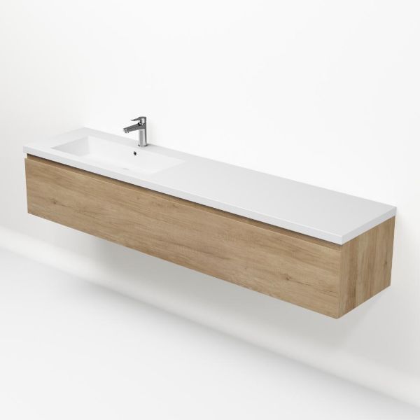 Greeploos badkamermeubel in de kleur olm is 200 cm breed. De wastafel is vervaardig in polystone en heeft de kleur wit. Dit badkamermeubel met deze wastafel is leverbaar tussen de 60 cm t/m 160 cm