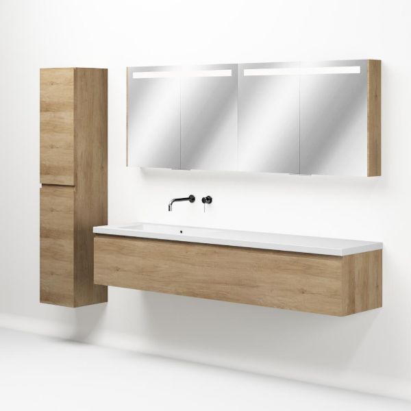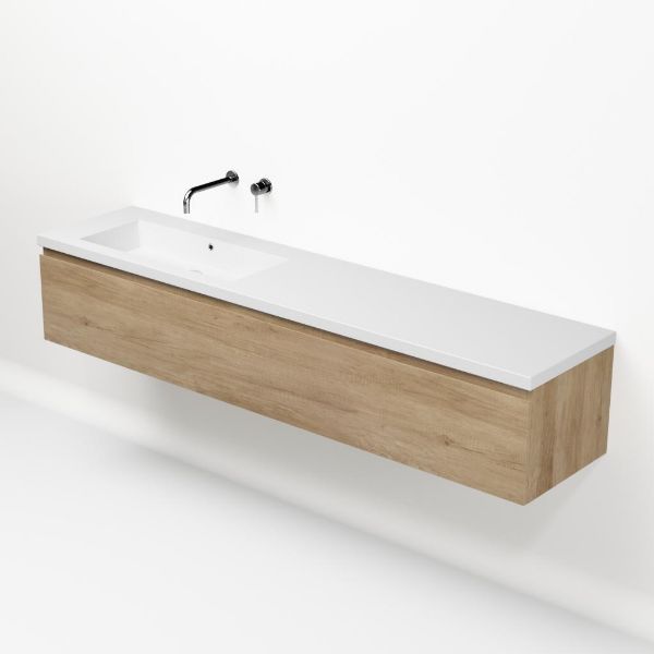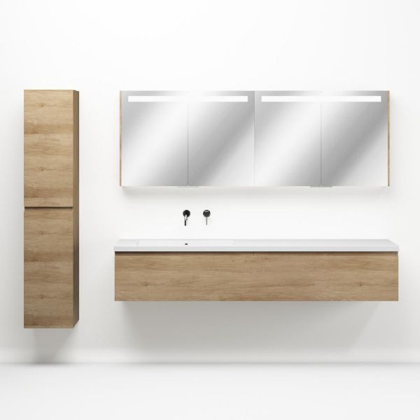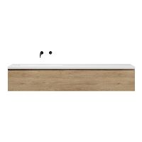 Greeploos badkamermeubel in de kleur olm is 200 cm breed. De wastafel is vervaardig in polystone en heeft de kleur wit. Dit badkamermeubel met deze wastafel is leverbaar tussen de 60 cm t/m 160 cm