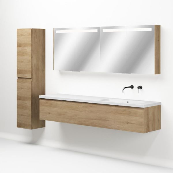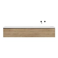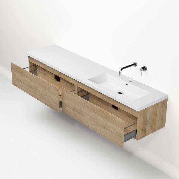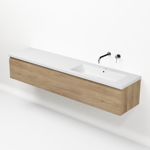 Greeploos badkamermeubel in de kleur olm is 200 cm breed. De wastafel is vervaardig in polystone en heeft de kleur wit. Dit badkamermeubel met deze wastafel is leverbaar tussen de 60 cm t/m 160 cm