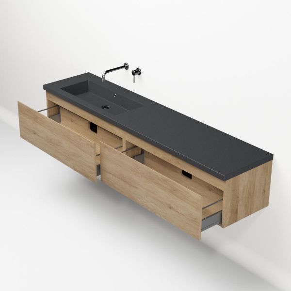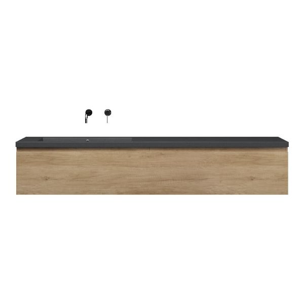 Greeploos badkamermeubel in de kleur olm is 200 cm breed. De wastafel is vervaardig in quartz en heeft de kleur grijs mat quartz. Dit badkamermeubel met deze wastafel is leverbaar tussen de 60 cm t/m 160 cm