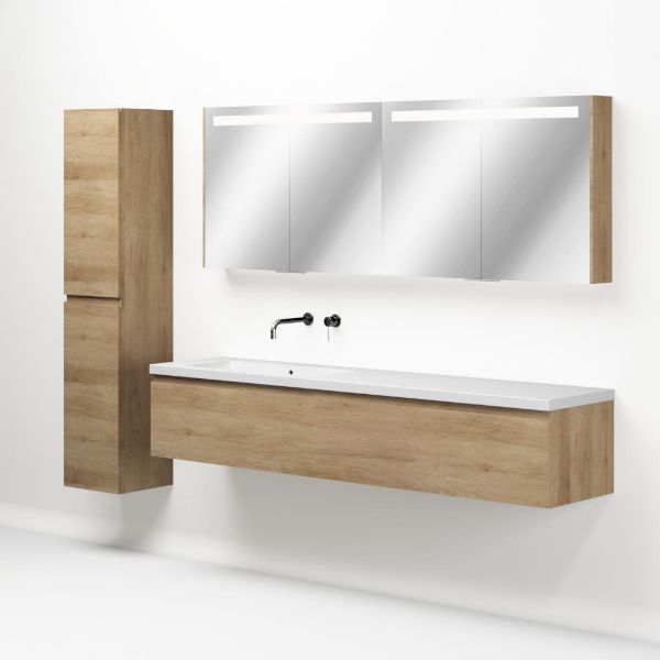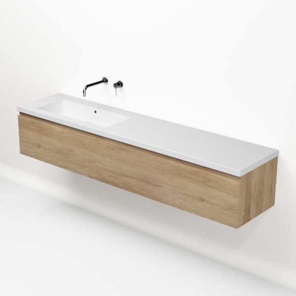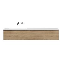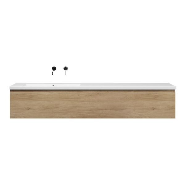 Greeploos badkamermeubel in de kleur olm is 200 cm breed. De wastafel is vervaardig in quartz en heeft de kleur wit mat keramiek. Dit badkamermeubel met deze wastafel is leverbaar tussen de 60 cm t/m 160 cm