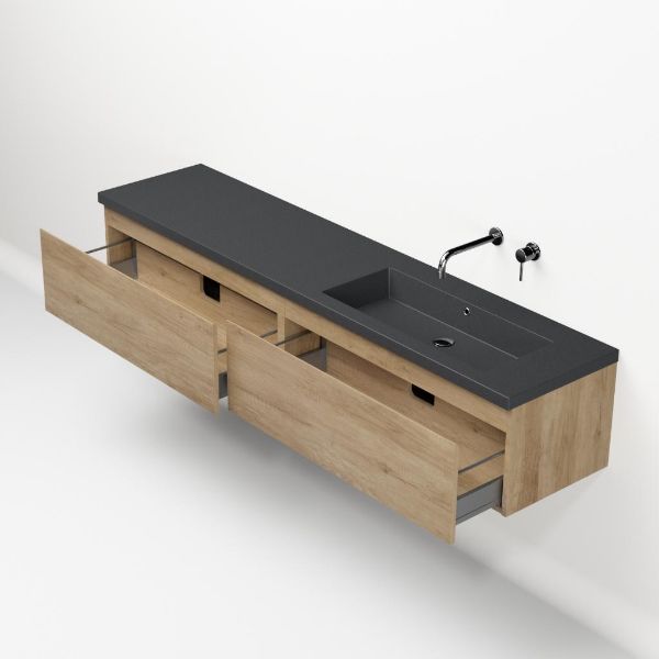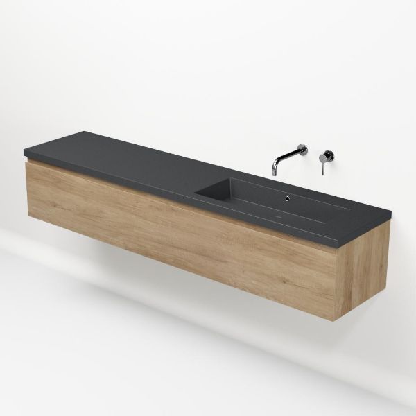 Greeploos badkamermeubel in de kleur olm is 200 cm breed. De wastafel is vervaardig in quartz en heeft de kleur grijs mat quartz. Dit badkamermeubel met deze wastafel is leverbaar tussen de 60 cm t/m 160 cm