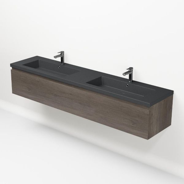 Greeploos badkamermeubel in de kleur olm donker grijs is 200 cm breed. De wastafel is vervaardig in quartz en heeft de kleur grijs mat quartz. Dit badkamermeubel met deze wastafel is leverbaar tussen de 60 cm t/m 160 cm