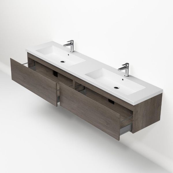 Greeploos badkamermeubel in de kleur olm donker grijs is 200 cm breed. De wastafel is vervaardig in quartz en heeft de kleur wit mat keramiek. Dit badkamermeubel met deze wastafel is leverbaar tussen de 60 cm t/m 160 cm