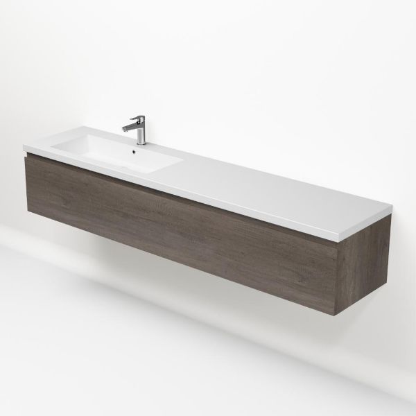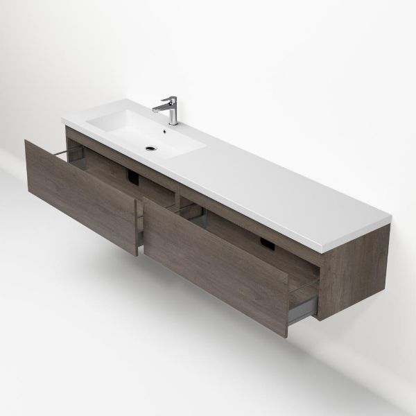 Greeploos badkamermeubel in de kleur olm donker grijs is 200 cm breed. De wastafel is vervaardig in quartz en heeft de kleur wit mat keramiek. Dit badkamermeubel met deze wastafel is leverbaar tussen de 60 cm t/m 160 cm