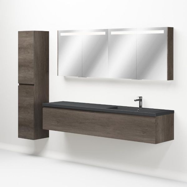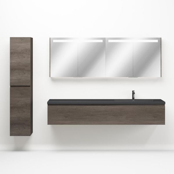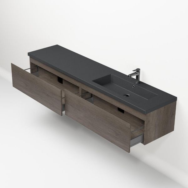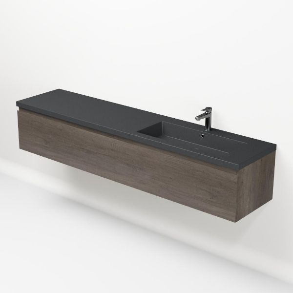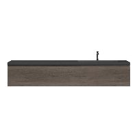 Greeploos badkamermeubel in de kleur olm donker grijs is 200 cm breed. De wastafel is vervaardig in quartz en heeft de kleur grijs mat quartz. Dit badkamermeubel met deze wastafel is leverbaar tussen de 60 cm t/m 160 cm