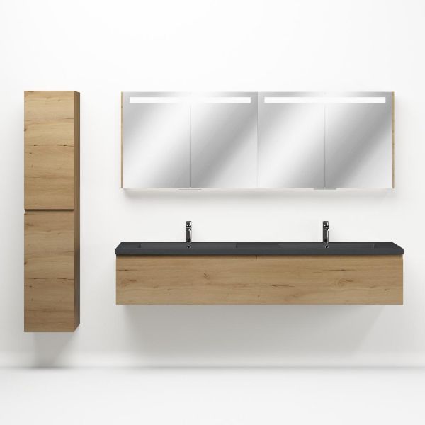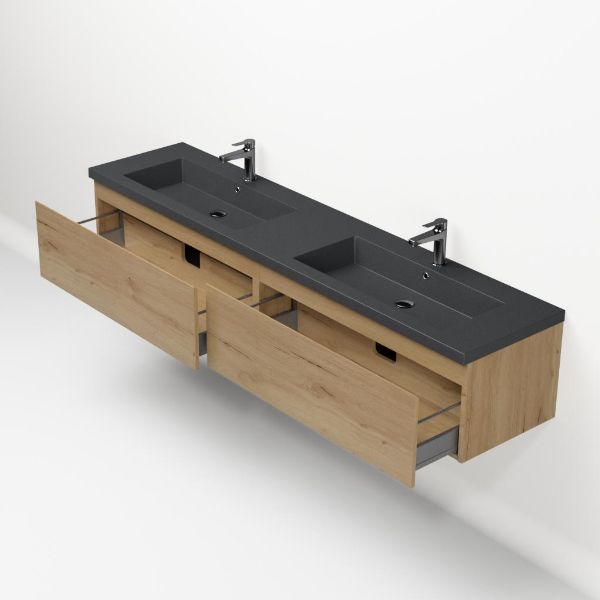 Greeploos badkamermeubel in de kleur eiken natuur is 200 cm breed. De wastafel is vervaardig in quartz en heeft de kleur grijs mat quartz. Dit badkamermeubel met deze wastafel is leverbaar tussen de 60 cm t/m 160 cm
