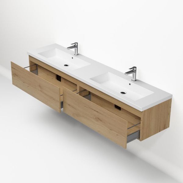 Greeploos badkamermeubel in de kleur eiken natuur is 200 cm breed. De wastafel is vervaardig in quartz en heeft de kleur wit mat keramiek. Dit badkamermeubel met deze wastafel is leverbaar tussen de 60 cm t/m 160 cm