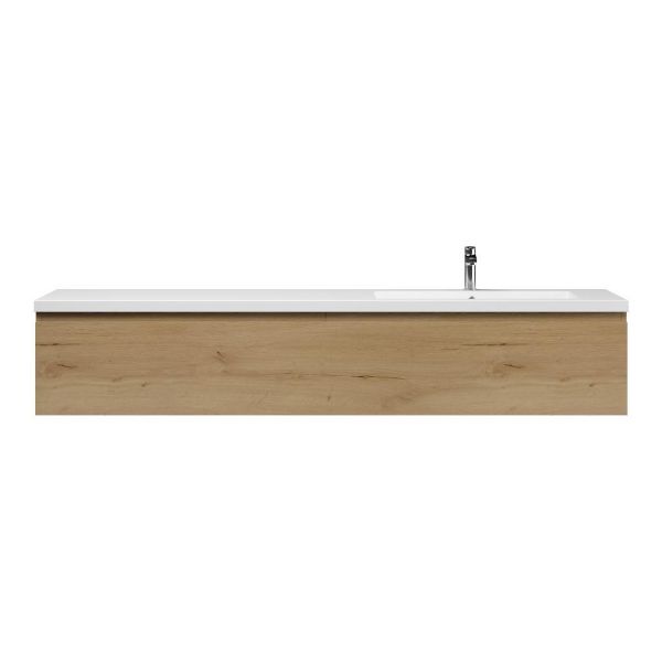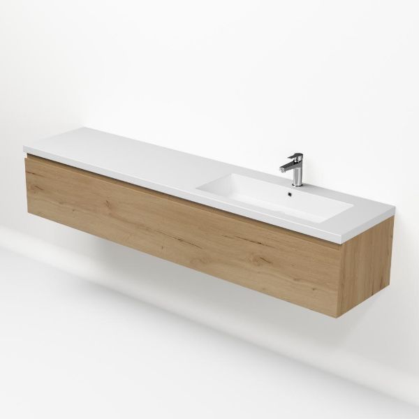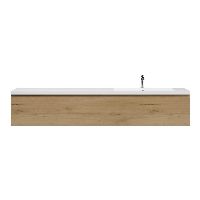 Greeploos badkamermeubel in de kleur eiken natuur is 200 cm breed. De wastafel is vervaardig in quartz en heeft de kleur wit mat keramiek. Dit badkamermeubel met deze wastafel is leverbaar tussen de 60 cm t/m 160 cm