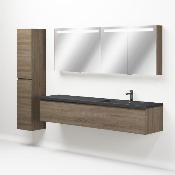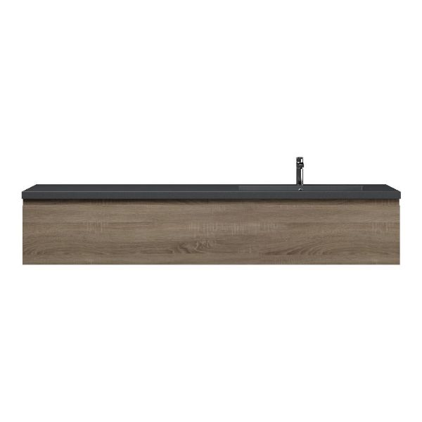 Greeploos badkamermeubel in de kleur eiken donker is 200 cm breed. De wastafel is vervaardig in quartz en heeft de kleur grijs mat quartz. Dit badkamermeubel met deze wastafel is leverbaar tussen de 60 cm t/m 160 cm