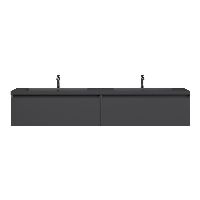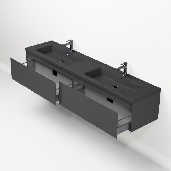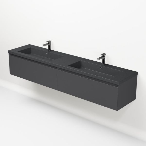 Greeploos badkamermeubel in de kleur antraciet mat is 200 cm breed. De wastafel is vervaardig in quartz en heeft de kleur grijs mat quartz. Dit badkamermeubel met deze wastafel is leverbaar tussen de 60 cm t/m 160 cm