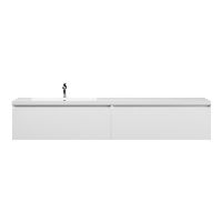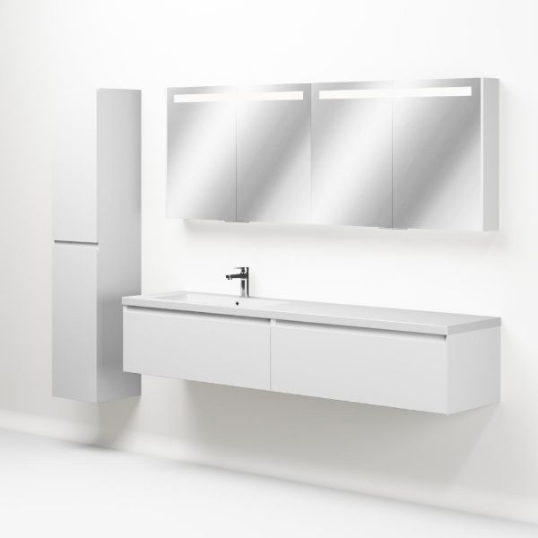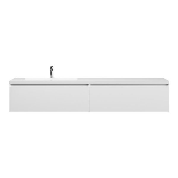 Greeploos badkamermeubel in de kleur wit mat is 200 cm breed. De wastafel is vervaardig in quartz en heeft de kleur wit mat keramiek. Dit badkamermeubel met deze wastafel is leverbaar tussen de 60 cm t/m 160 cm