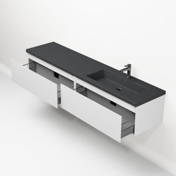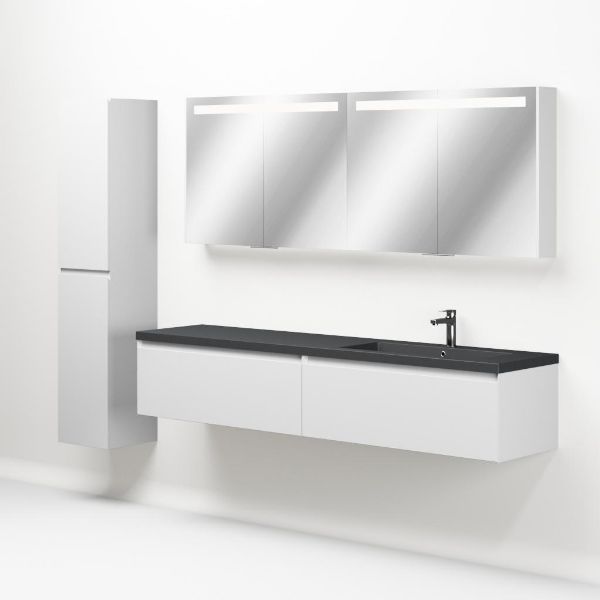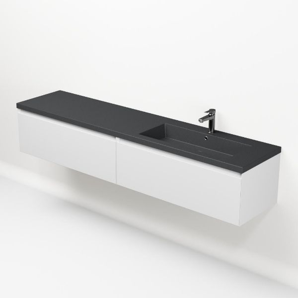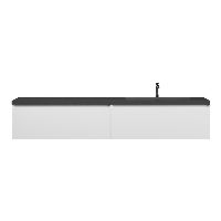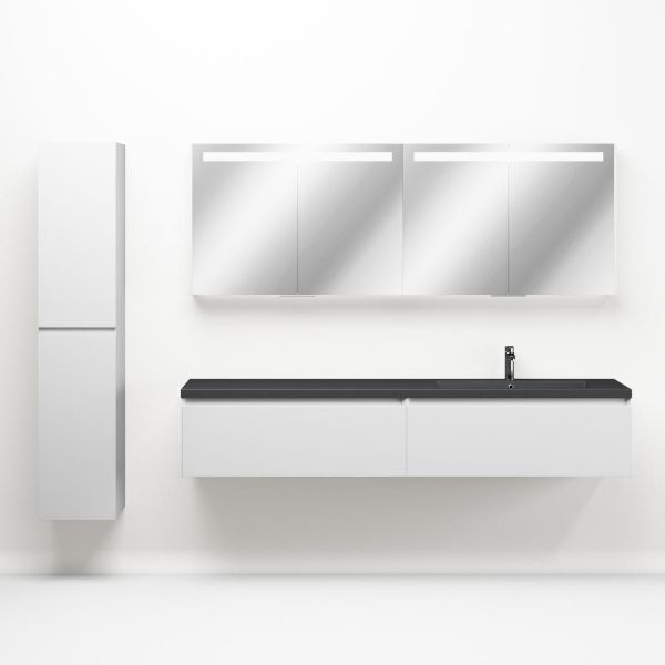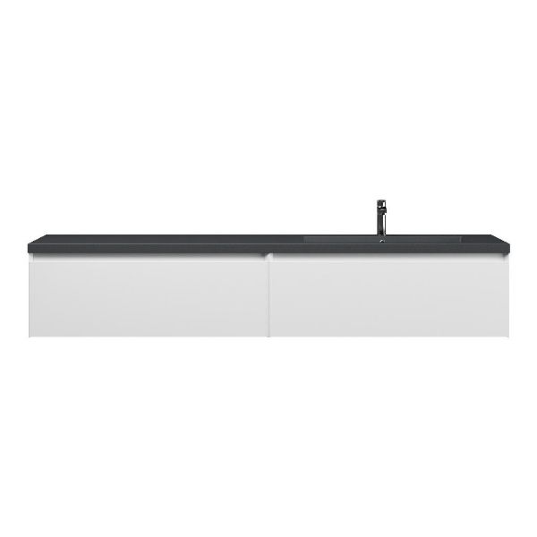 Greeploos badkamermeubel in de kleur wit mat is 200 cm breed. De wastafel is vervaardig in quartz en heeft de kleur grijs mat quartz. Dit badkamermeubel met deze wastafel is leverbaar tussen de 60 cm t/m 160 cm