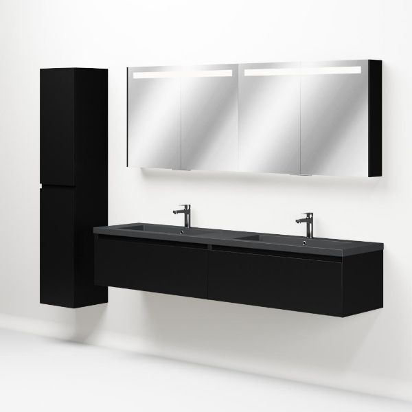 Greeploos badkamermeubel in de kleur zwart mat is 200 cm breed. De wastafel is vervaardig in quartz en heeft de kleur grijs mat quartz. Dit badkamermeubel met deze wastafel is leverbaar tussen de 60 cm t/m 160 cm
