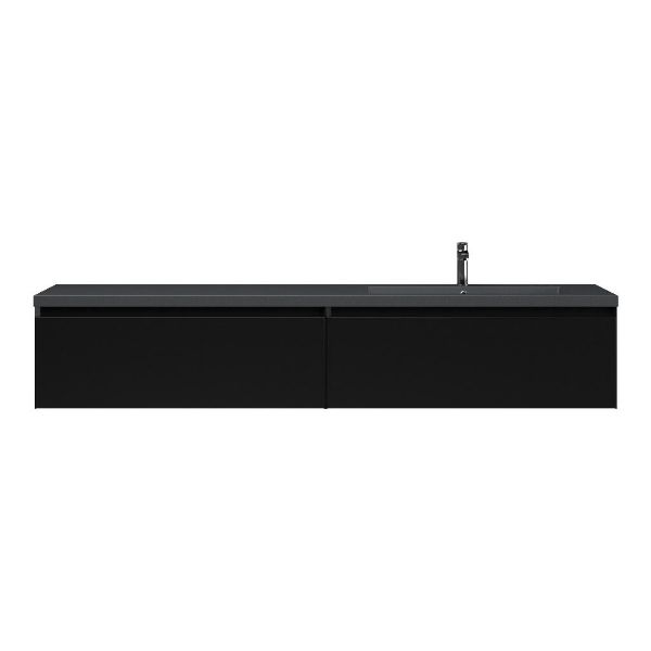 Greeploos badkamermeubel in de kleur zwart mat is 200 cm breed. De wastafel is vervaardig in quartz en heeft de kleur grijs mat quartz. Dit badkamermeubel met deze wastafel is leverbaar tussen de 60 cm t/m 160 cm