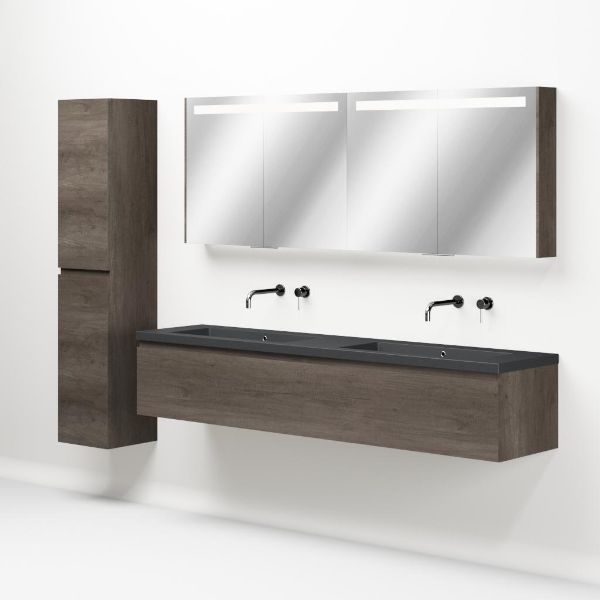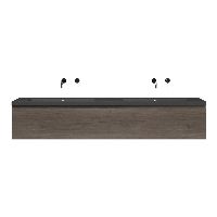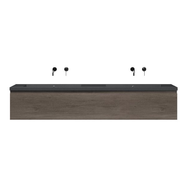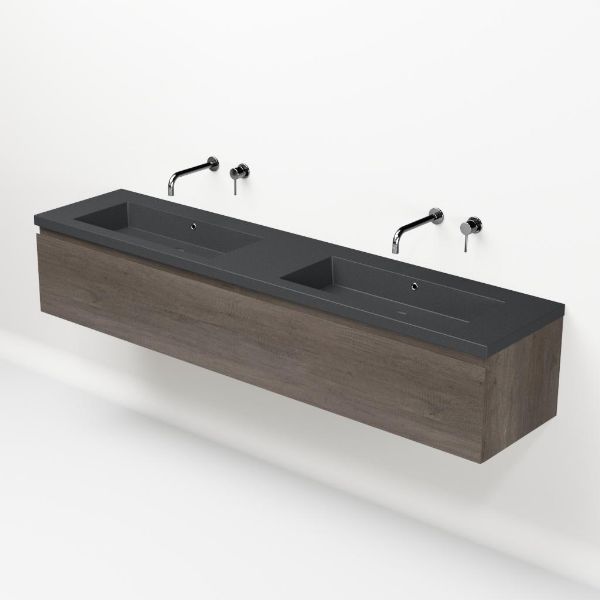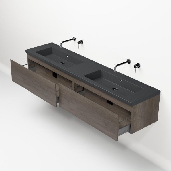 Greeploos badkamermeubel in de kleur olm donker grijs is 200 cm breed. De wastafel is vervaardig in quartz en heeft de kleur grijs mat quartz. Dit badkamermeubel met deze wastafel is leverbaar tussen de 60 cm t/m 160 cm