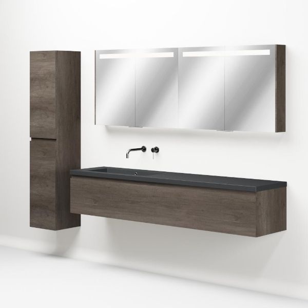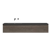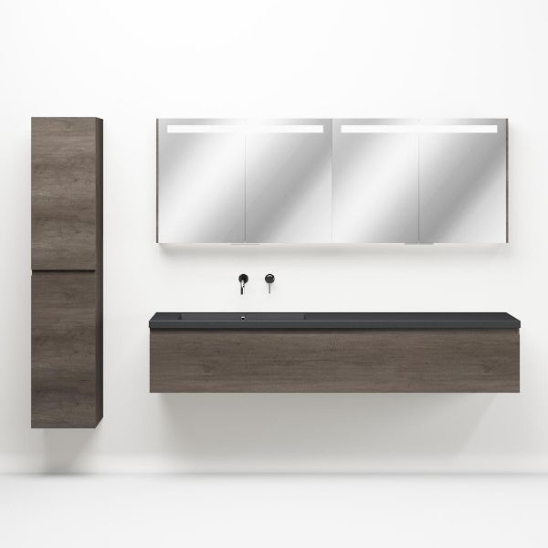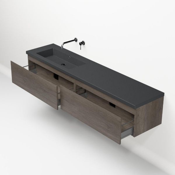 Greeploos badkamermeubel in de kleur olm donker grijs is 200 cm breed. De wastafel is vervaardig in quartz en heeft de kleur grijs mat quartz. Dit badkamermeubel met deze wastafel is leverbaar tussen de 60 cm t/m 160 cm