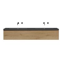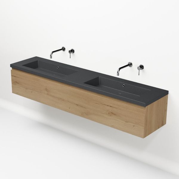 Greeploos badkamermeubel in de kleur eiken natuur is 200 cm breed. De wastafel is vervaardig in quartz en heeft de kleur grijs mat quartz. Dit badkamermeubel met deze wastafel is leverbaar tussen de 60 cm t/m 160 cm