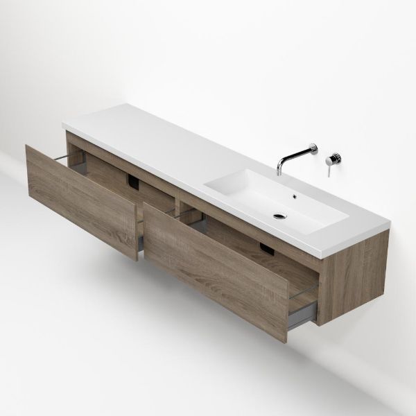 | Bellanti Solo/Esta-q badmeubel 200x46 2 softclose laden donker eiken greeploos quartz enkele wastafel rechts mat wit zonder kraangat |