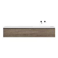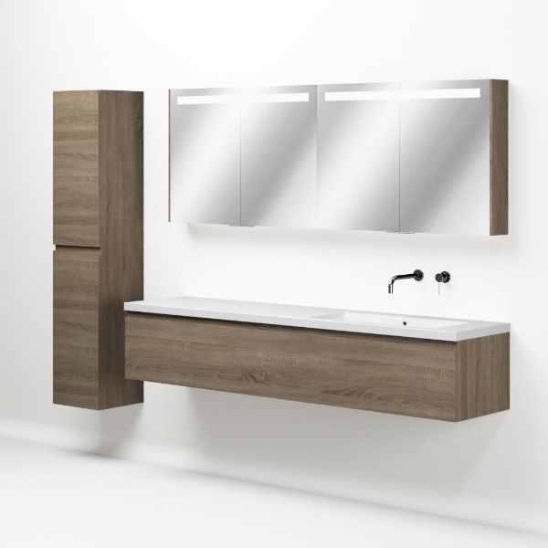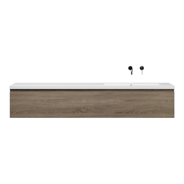 Greeploos badkamermeubel in de kleur eiken donker is 200 cm breed. De wastafel is vervaardig in quartz en heeft de kleur wit mat keramiek. Dit badkamermeubel met deze wastafel is leverbaar tussen de 60 cm t/m 160 cm