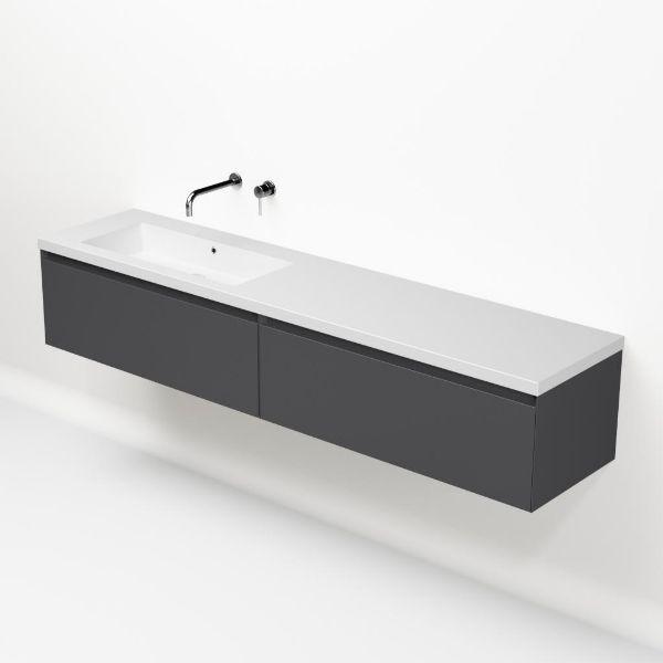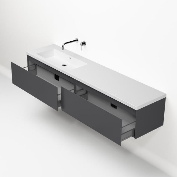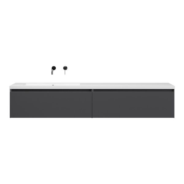 Greeploos badkamermeubel in de kleur antraciet mat is 200 cm breed. De wastafel is vervaardig in quartz en heeft de kleur wit mat keramiek. Dit badkamermeubel met deze wastafel is leverbaar tussen de 60 cm t/m 160 cm