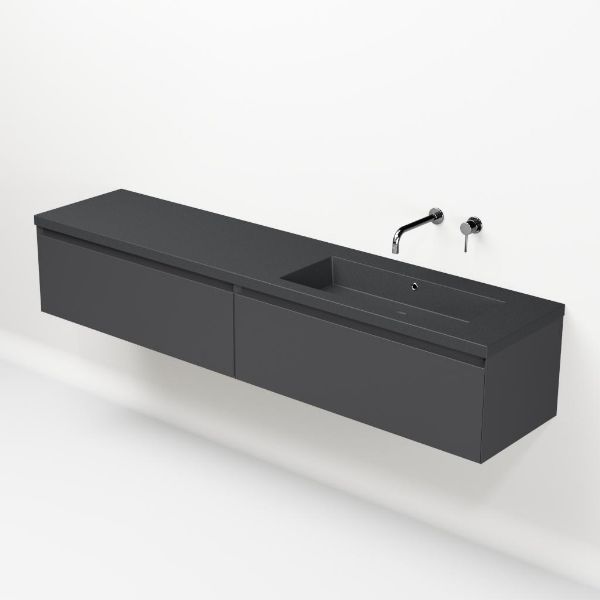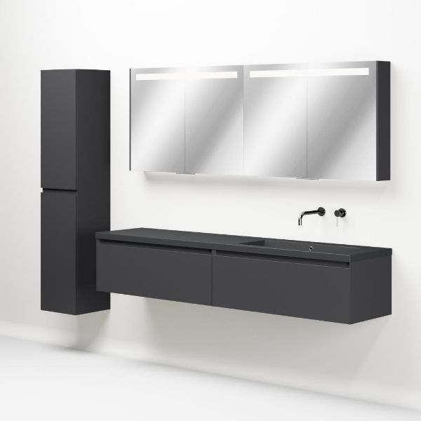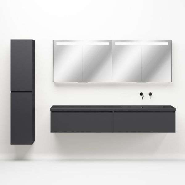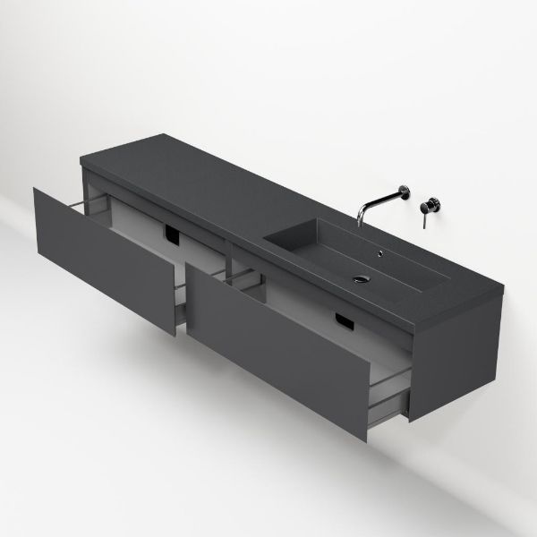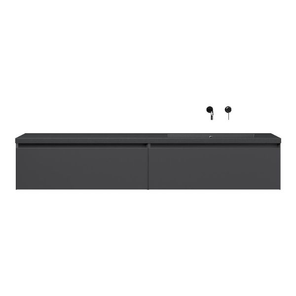 Greeploos badkamermeubel in de kleur antraciet mat is 200 cm breed. De wastafel is vervaardig in quartz en heeft de kleur grijs mat quartz. Dit badkamermeubel met deze wastafel is leverbaar tussen de 60 cm t/m 160 cm