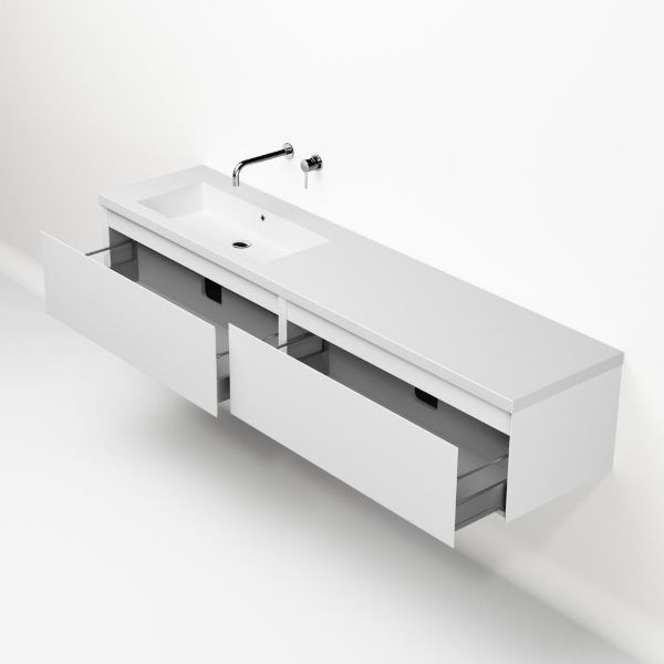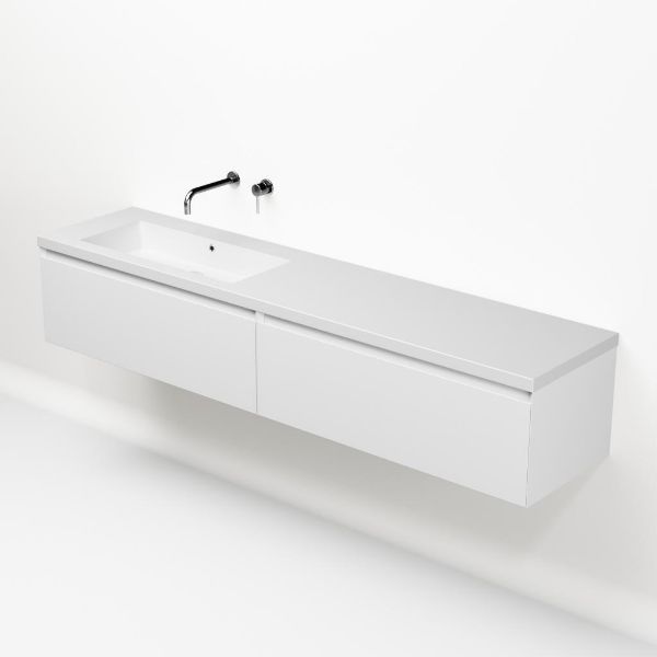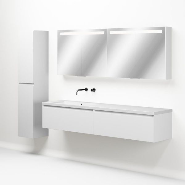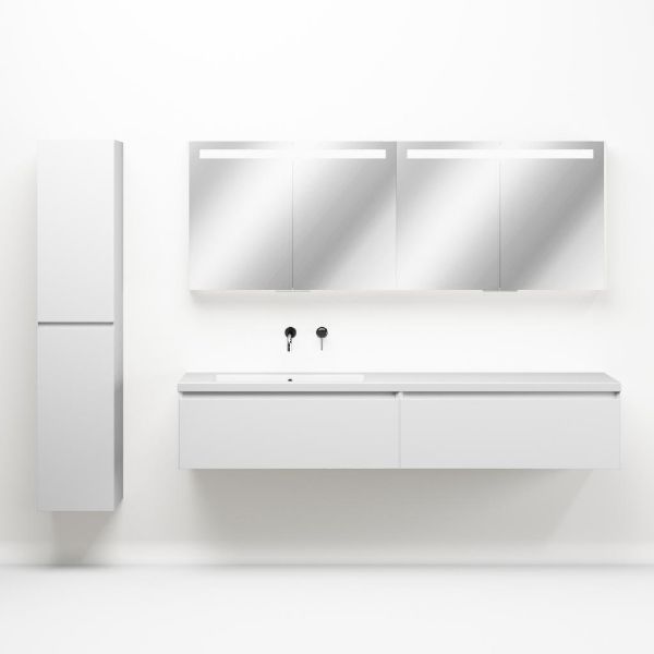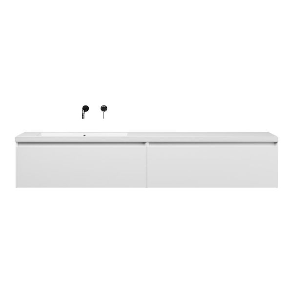 Greeploos badkamermeubel in de kleur wit mat is 200 cm breed. De wastafel is vervaardig in quartz en heeft de kleur wit mat keramiek. Dit badkamermeubel met deze wastafel is leverbaar tussen de 60 cm t/m 160 cm
