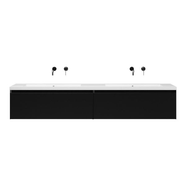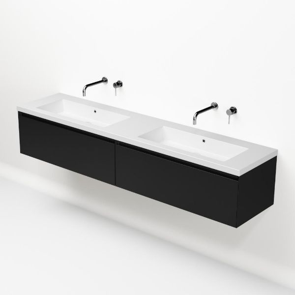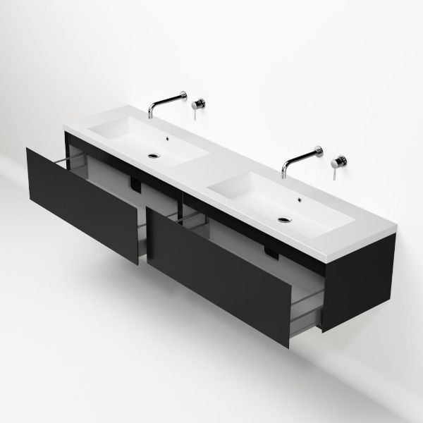 Greeploos badkamermeubel in de kleur zwart mat is 200 cm breed. De wastafel is vervaardig in quartz en heeft de kleur wit mat keramiek. Dit badkamermeubel met deze wastafel is leverbaar tussen de 60 cm t/m 160 cm